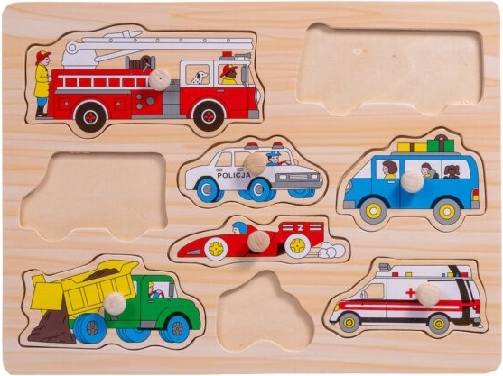 Descoperă puzzle-ul din lemn cu mânere cu tematică de vehicule, care îi ajută pe copii să-și dezvolte motricitatea fină, abilitățile cognitive și recunoașterea formelor și culorilor. Nouă piese rezistente, cu mânere din lemn confortabile, se prind și se așază ușor la locul potrivit – ideal pentru micii pasionați de mașini, trenuri și alte utilaje.