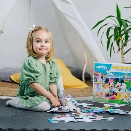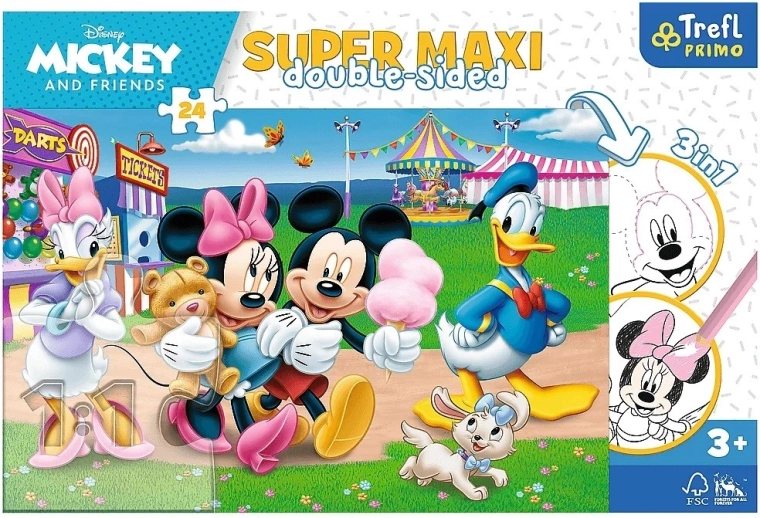 Pe verso-ul fiecărei piese se găsesc până la două activități amuzante – o planșă de colorat și un joc cu elemente de colorare – o provocare pentru adevărații îndemânatici! Puzzle-urile Super Maxi 24 combină distracția grozavă cu bucuria propriei creații. Sunt disponibile modele cu personaje îndrăgite din filme și seriale de animație pentru copii.