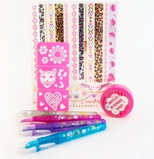 - Setul de markere pentru tatuaje conține: 4 markere sclipitoare pentru tatuaje, 3 șabloane, 1 coală de tatuaje metalice, 30 șervețele pentru îndepărtarea tatuajelor.