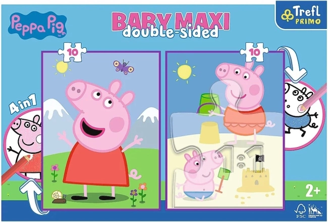 Puzzle Zi Veselă cu Peppa din seria Terfl Primo oferă până la 4 activități într-un singur set! Conține două puzzle-uri mari cu 10 piese mari, ideale pentru cei mai mici copii de la 2 ani. Pe spatele puzzle-urilor se găsesc mari desene de colorat cu personaje preferate din animațiile pentru copii.