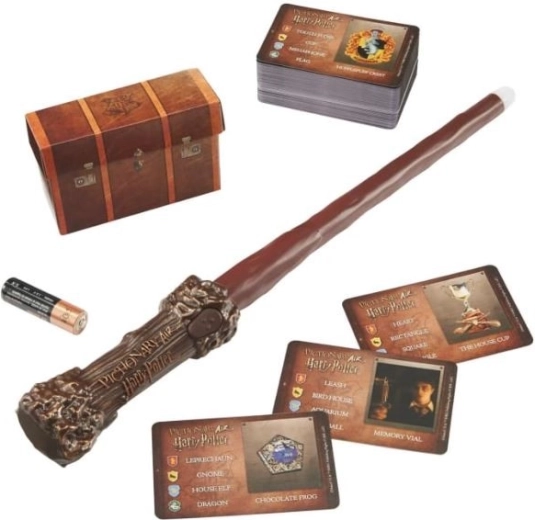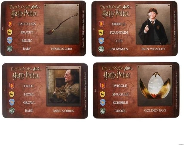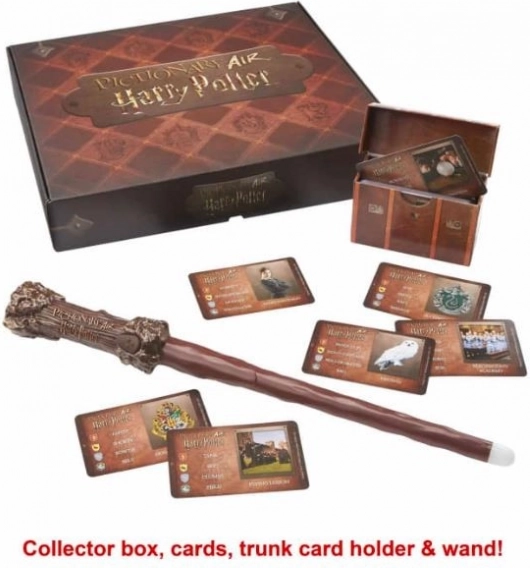Fiecare echipă alege o Casă de la Hogwarts în care va juca (Gryffindor, Hufflepuff, Slytherin sau Ravenclaw). Deschide cutia colecționarului pentru a descoperi un stilou Pictionary Air în forma celebrei baghete a lui Harry Potter, un etui pentru cărți inspirat din cufărul lui Harry și 112 cărți cu îndrumări inspirate din Lumea Vrăjitorilor.