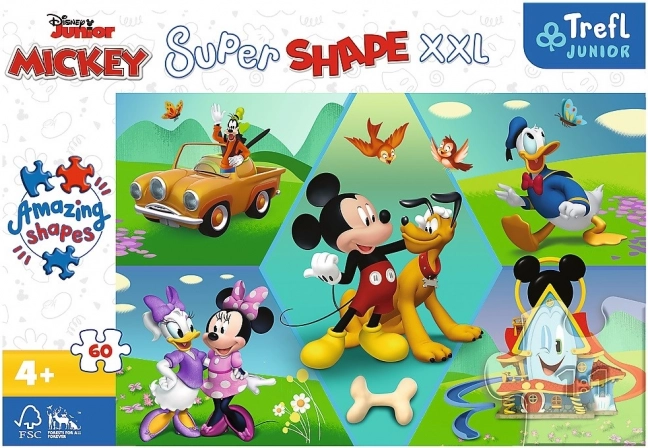 Puzzle de mari dimensiuni Super Shape cu motivul MICKEY MOUSE oferă 60 de piese XXL, printre care se regăsesc și piese cu forme neobișnuite. Datorită pieselor mai mari, se asamblează excelent, dezvoltă motricitatea fină și aduc multă distracție pentru copii.