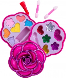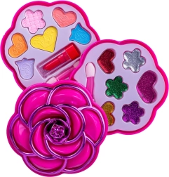 Un set cosmetic adorabil pentru micile prințese, în formă de floare, care oferă primii pași în lumea machiajului. Conține două niveluri de farduri de pleoapestriălucitoare și cu sclipici, precum și nuanțe pastel – și un ruj roșu. Etuiul compact, în culoarea roz îndrăgită, încape ușor în poșeta micii domnișoare după închidere.