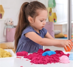 Jocul cu nisipul kinetic dezvoltă motricitatea fină și creativitatea copiilor. Textura specială și structura plastică a nisipului oferă o experiență tactilă deosebit de plăcută. Mișcarea nisipului are efect relaxant și calmant.