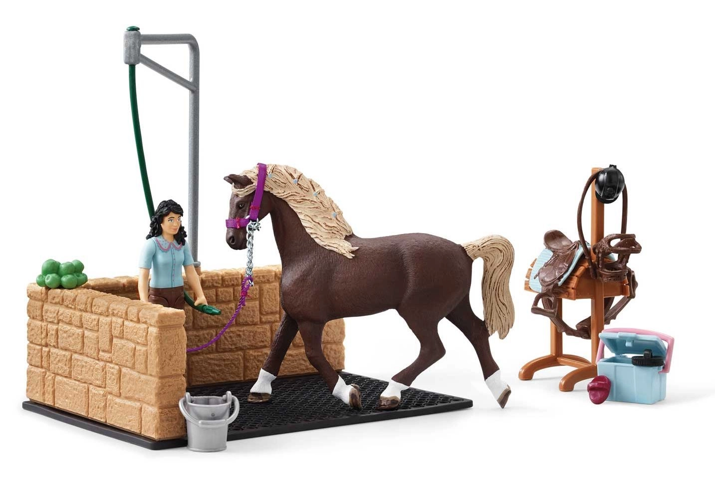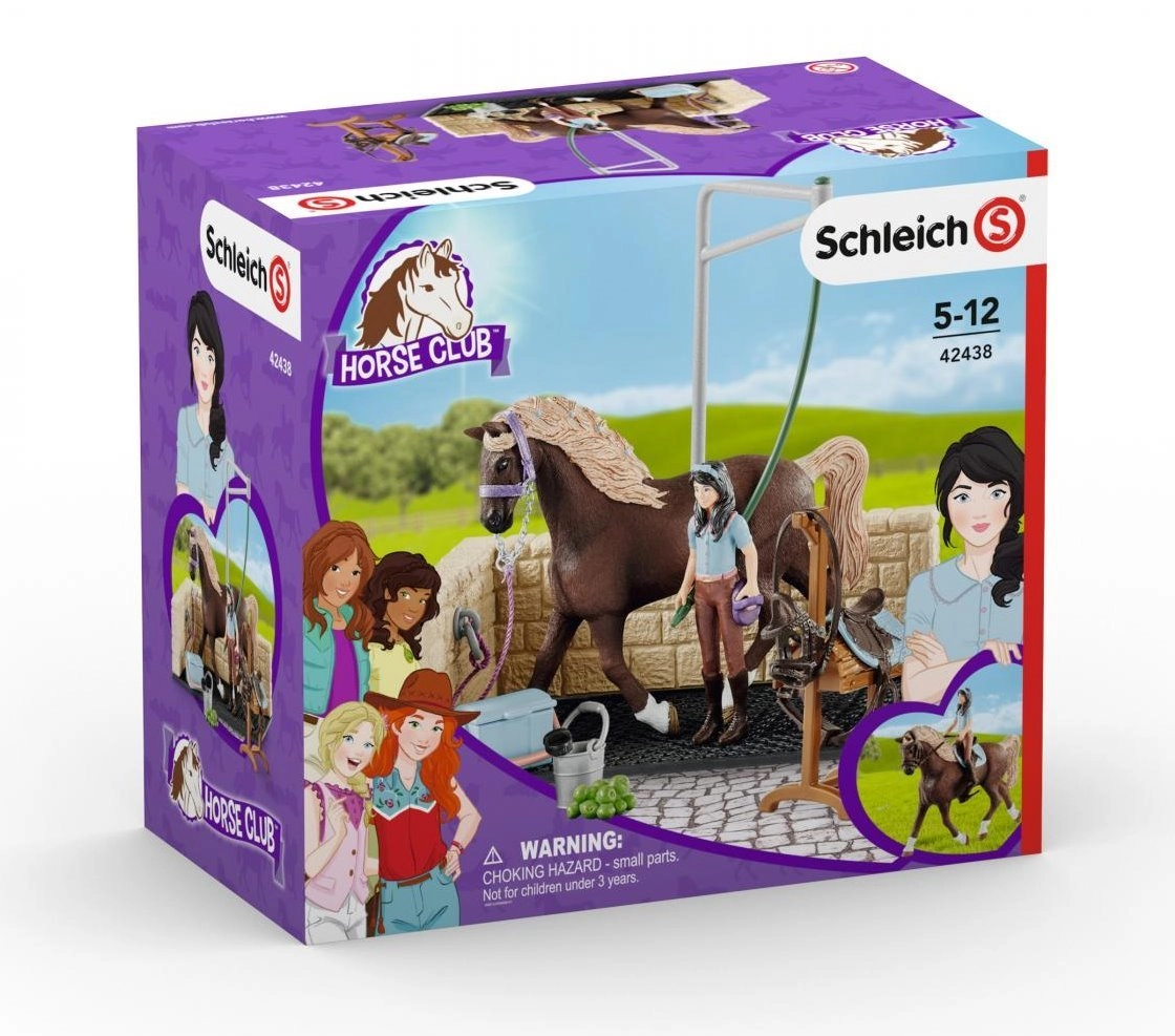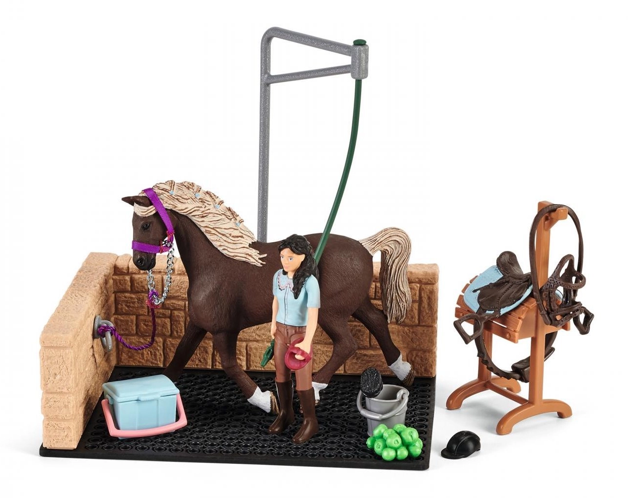Setul de spălare cu Emily și Luna de la Schleich® Horse Club este un produs modern și practic pentru iubitorii de cai. Acest set include o figură Emily complet articulată, care aranjează șaua și zăbala pe un suport, leagă frâul mânzului său de rasă Holsteiner, numit Luna, și îi curăță blana cu un piepten și o perie din cutia cu accesorii de igienă.