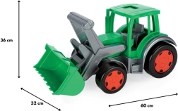Tractor masiv, mare, de 60 cm lungime, cu încărcător frontal, în culori interesante de fermă.