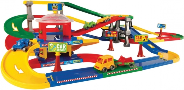 Acest complex de parcare din seria Play Tracks Garage are o construcție ușoară, care permite asamblarea pistelor în forme diferite, diversificând astfel jocul copilului. Setul include o parcare pe două niveluri și o pistă de unsprezece metri.