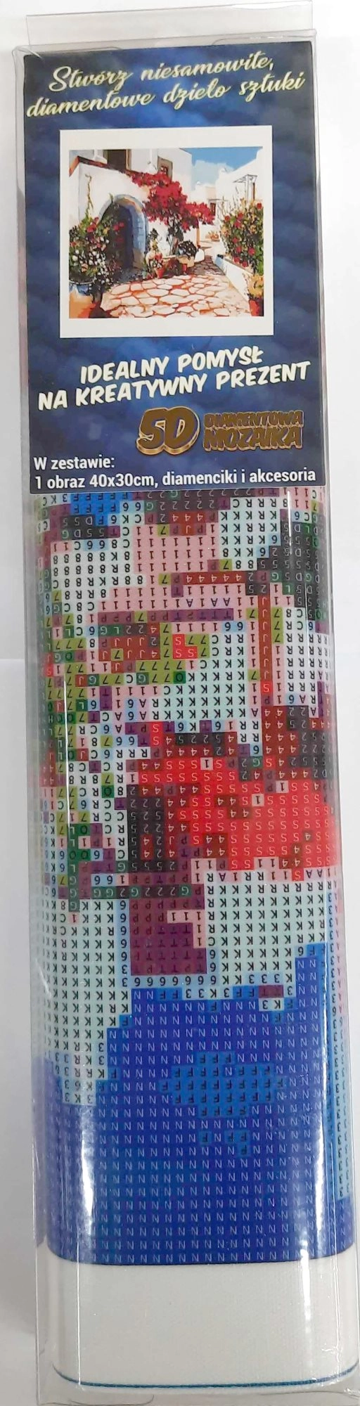 Pictura cu diamante – proces: Pânza are un strat lipicios acoperit cu folie, pe care o îndepărtați treptat. Dați folia jos pe măsură ce aplicați pietricelele, pentru a nu murdări stratul lipicios. Aplicați pietricelele conform semnelor de pe pânză, care corespund legendei anexate.
