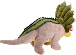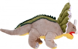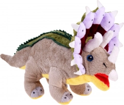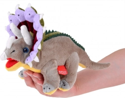 Acest dinozaur de pluș reprezintă o replică fidelă a Triceratops-ului cu coarnele sale caracteristice și ochii albastru strălucitor.