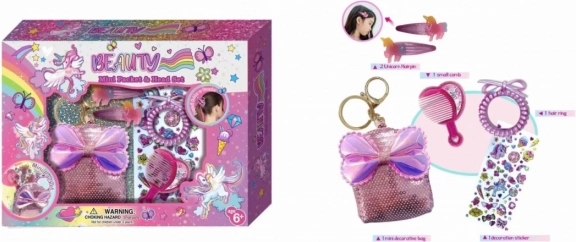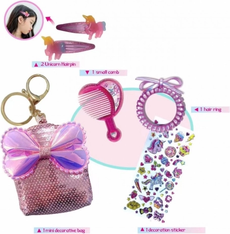 Un set drăguț pentru păr, pentru fete, cu motiv unicorn, care va încânta orice mică domnișoară. Conține o gentuță decorativă cu paiete și fundiță, care poate servi și ca breloc, plus 2 agrafe cu unicorn, un pieptene, un elastic spirală și un sticker sheet. Ideal ca cadou.