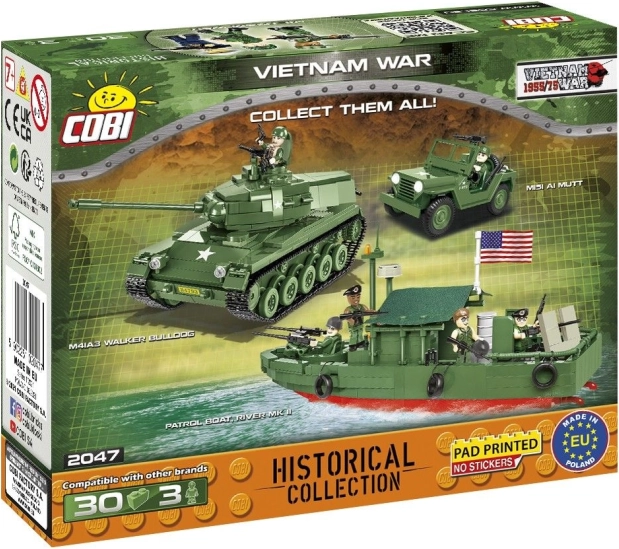 Recreează atmosfera războiului din Vietnam cu un trio de figurine realizate cu detalii fine. Soldatul Vietcong are uniformă tipică, pălărie de paie și iconicul AK‑47. Parașutistul american din Divizia 101 Aeropurtată poartă pe umăr imprimeul cu vultur și este înarmat cu o pușcă M16. A treia figurină reprezintă US Marines cu vestă antiglonț peste bustul gol, cască realistă camuflată și o pușcă M16 cu aruncător de grenade.