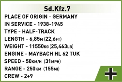 Modelul Sd.Kfz. 7 este conceput la scara de modelism 1:35, cu accent pe detalii și funcționalitate – nu lipsesc șenilele, roțile realiste și componentele controlabile.