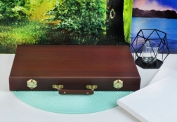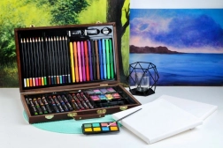 Toate materialele de artă sunt aranjate ordonat într-o servietă pliabilă din lemn, cu compartimente, astfel încât aveți mereu acces rapid și ușor la tot ce aveți nevoie.