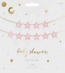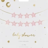Banner stilat cu inscripția Baby Shower în nuanță delicată de roz deschis, care completează frumos decorul petrecerii pentru venirea bebelușului. Decorațiunile în formă de steluțe oferă o atmosferă gingașă, iar datorită lungimii de aproximativ 3 m este perfect pentru a fi suspendat deasupra candy bar-ului, fotocolțului sau la intrare.