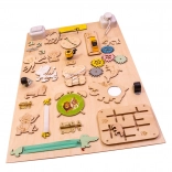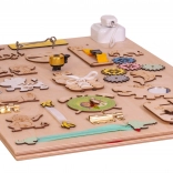 Placa conține roți colorate, clopoței, încuietori și alte elemente interactive care susțin dezvoltarea motricității fine.