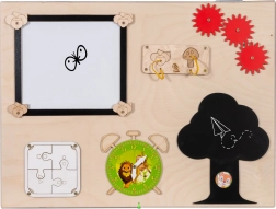 Elementele interactive nu doar că stimulează îndemânarea, dar și capacitatea de gândire logică a copilului dvs. Construcția pe două fețe permite flexibilitate în amplasarea pe masă sau podea și producția din lemn garantează longevitate.