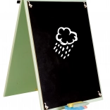 Pe cealaltă parte, tabla este echipată cu o suprafață de scris cu cretă. Setul include cretă și burete. Tabla este realizată din lemn de calitate, fiind o alternativă ecologică la jucăriile din plastic și oferă o durabilitate mai mare.