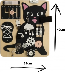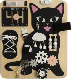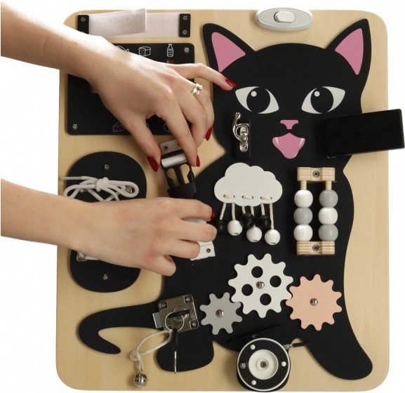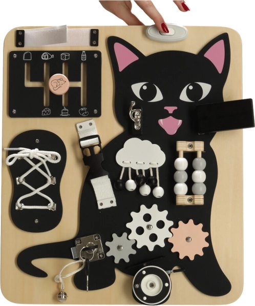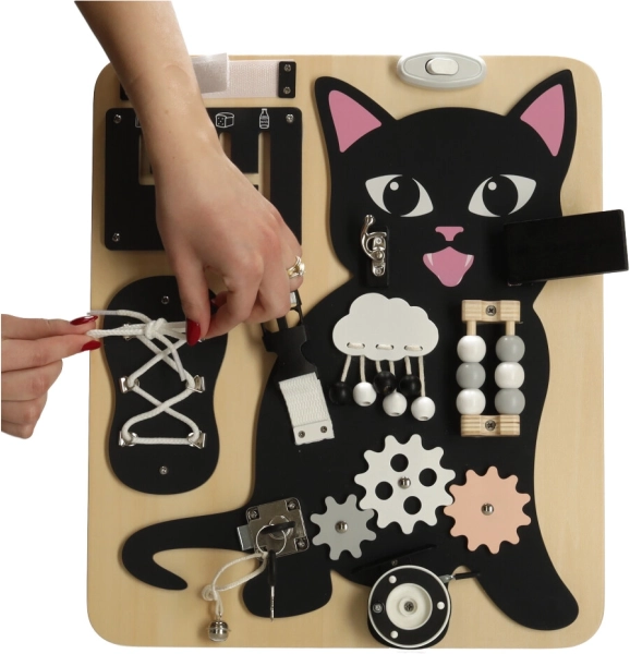 Tablă Lulilo în formă de pisică este o jucărie educativă preferată de copii, care îi îndeamnă să rotească, să tragă, să lege și să mute. Îi ajută să dezvolte motricitatea fină, precizia mișcărilor și forța mâinilor. Puzzle-urile și sarcinile distractive stimulează abilitățile cognitive ale copiilor și le aduc satisfacție prin reușite.