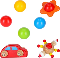 Sunt incluse bile colorate, o mașinuță roșie din lemn și accesorii tip figurină pentru jocuri variate și curse.