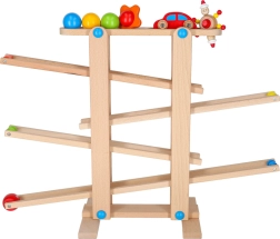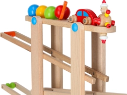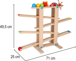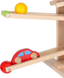 Rampa în zig-zag din lemn neted asigură o mișcare fluidă a bilelor și a mașinuței și sprijină coordonarea și răbdarea în timpul jocului.