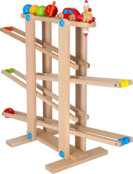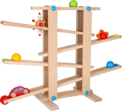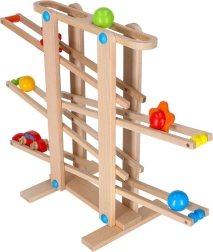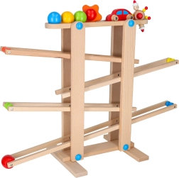 Toate piesele sunt fin șlefuite pentru o prindere sigură de către mânuța copilului. Jocul de curse dezvoltă coordonarea mână–ochi, înțelegerea cauzei și efectului și răbdarea. Setul este livrat ca asamblare ușoară, iar în pachet găsești tot ce este necesar, inclusiv bile colorate și mașinuță din lemn.