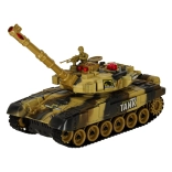 Tancul RC în variantă deșert oferă deplasare lină înainte/înapoi, întoarcere pe loc și turelă rotativă cu 180° în fiecare direcție (sector de tragere total 360°). Șenilele din cauciuc moale asigură aderență bună pe diverse suprafețe. La tragere, tancul simulează recul realist și este însoțit de sunete de motor și foc.