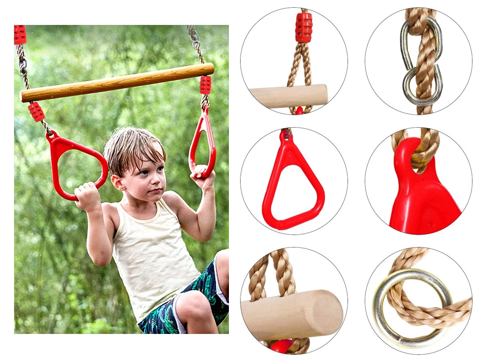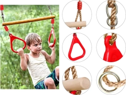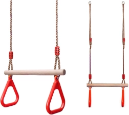 Construcția robustă cu bară naturală din lemn, frânghii rezistente și reglabile și mânere ergonomice este concepută pentru utilizare sigură și confortabilă. Elementele colorate îi motivează pe copii la mișcare, cățărare și legănare.