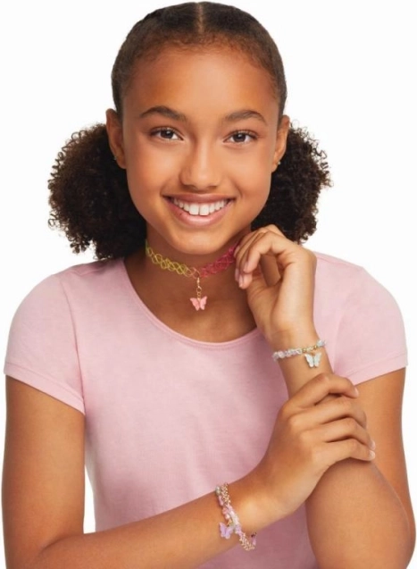 Creați propria colecție de accesorii de modă cu acest set uimitor pentru realizarea bijuteriilor! Conține tot ce este necesar pentru realizarea a *trei brățări* și *două coliere* , inclusiv un *choker elastic la modă* .