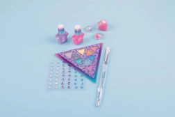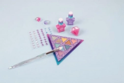 - Paletă de farduri de ochi, pensulă cosmetică, foaie de cristale, luciu de buze, 2 inele, 2 lacuri de unghii