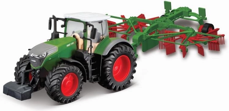 Model de tractor agricol Bburago Farm Tractor Fendt 1050 Vario cu greblă pentru fân (întoarcător de furaje) realizat din piese metalice și din plastic, bazat pe modelul tractorului care reprezintă vârful de gamă al seriei 1000 Vario.