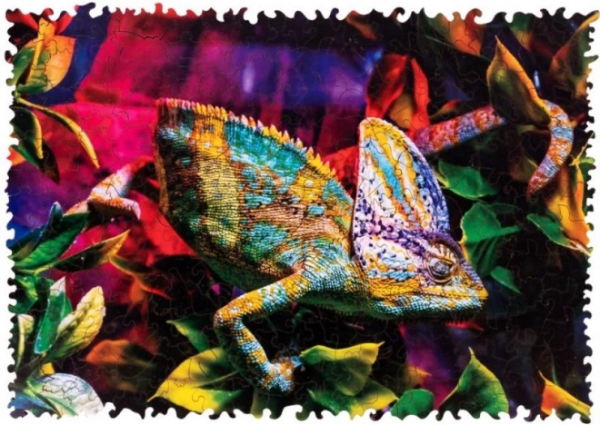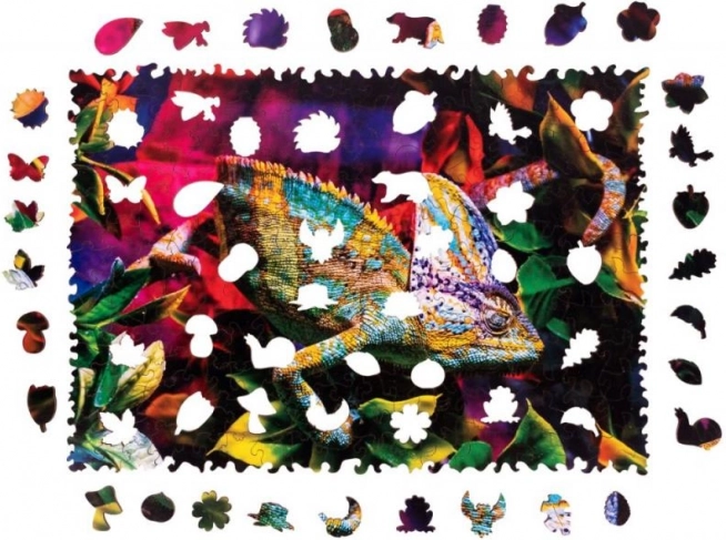 Acest puzzle din lemn cu design din lemn de fag dur te poartă în lumea cameleonului colorat și a frunzelor tropicale. Datorită pieselor special fasonate, dintre care multe au formă de animale și plante, asamblarea este distractivă, creativă și totodată ceva mai provocatoare decât puzzle-urile clasice.