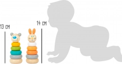 O jucărie din lemn atemporală, care crește odată cu copilul. Cei mici sortează și așază inelele pe tijă, le ordonează după mărime și descoperă culorile. Figurinele de iepuraș și urs îi motivează la joacă și, în același timp, decorează camera copiilor prin aspectul lor delicat pastelat.