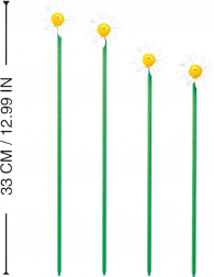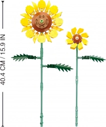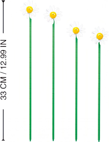 După asamblare, obțineți două flori-soarelui expresive și patru margarete delicate – o decorațiune perfectă pentru casă și un cadou original pentru iubitorii de flori și seturi de construcție.
