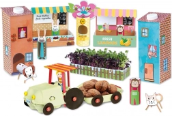 Eco sătuc de la compania Lena vă oferă posibilitatea de a recicla în loc să aruncați. Cu această cutie creativă, veți transforma materiale de ambalare vechi într-un mic sătuc cu piață, grădină și case.