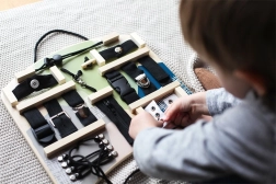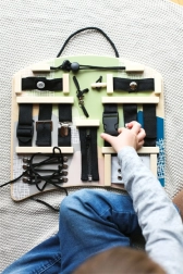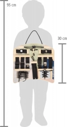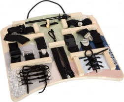 Această placă activă interactivă oferă o gamă largă de elemente de prindere și legare, pe care copiii le cunosc din viața de zi cu zi. Prin închiderea și deschiderea fermoarelor, închiderea nasturilor, strângerea cataramelor sau legarea șireturilor, își exersează priza precisă, răbdarea și coordonarea mișcărilor. Forma ergonomică este comodă pentru joacă atât în fața copilului, cât și pe genunchi, iar datorită mânerului practic, placa poate fi agățată cu ușurință.