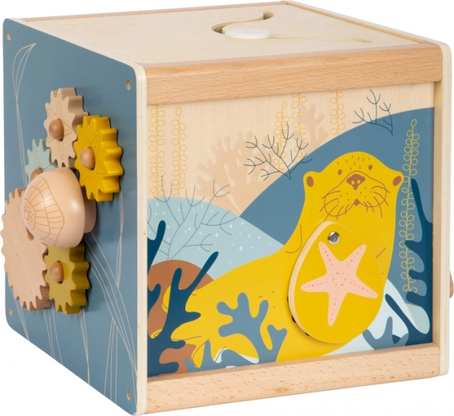 Cub motric din lemn, versatil, cu motiv marin de la Small Foot, oferă 5 suprafețe de joc, două labirinturi cu mărgele, rotițe dințate rotative cu stele detașabile și o meduză moale pentru sortarea formelor. Sprijină motricitatea fină, coordonarea mână–ochi și percepția senzorială. Capacul detașabil economisește spațiu la depozitare, marginile rotunjite sigure și prelucrarea de calitate din lemn în culori la modă îi vor încânta pe copii și părinți.
