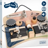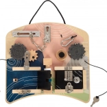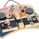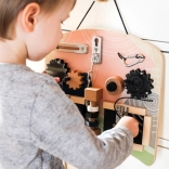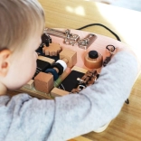 Această „busy board” montessori stilată, în culori pastelate plăcute, oferă copiilor numeroase posibilități de explorare. Diverse lacăte și zăvoare familiare din viața de zi cu zi, angrenaje cu mini labirint, bară filetată cu elemente rotative și un claxon piuitor distractiv dezvoltă abilitățile prin joc și motivează învățarea naturală.