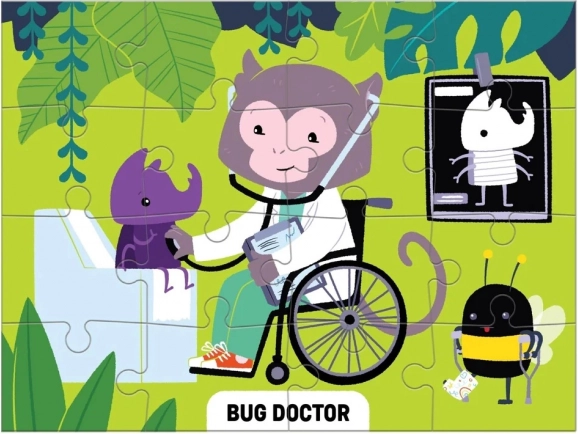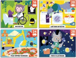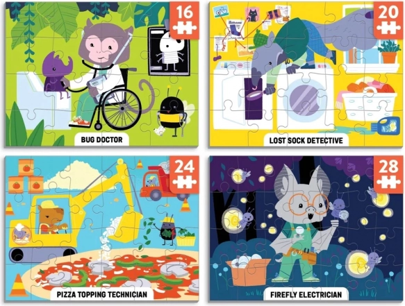 Descoperiți patru puzzle-uri amuzante într-un singur set! Setul Mudpuppy Level Up! oferă puzzle-uri cu niveluri diferite de dificultate (16, 20, 24 și 28 de piese), care prezintă copiilor profesii creative și haioase – de la electricianul licuricilor la doctorul gândăceilor. Puzzle-urile sunt fabricate din materiale reciclate, au suprafață mată pentru culori fidele și sunt ambalate într-o cutie rezistentă, ideală pentru reutilizare și ca cadou original.