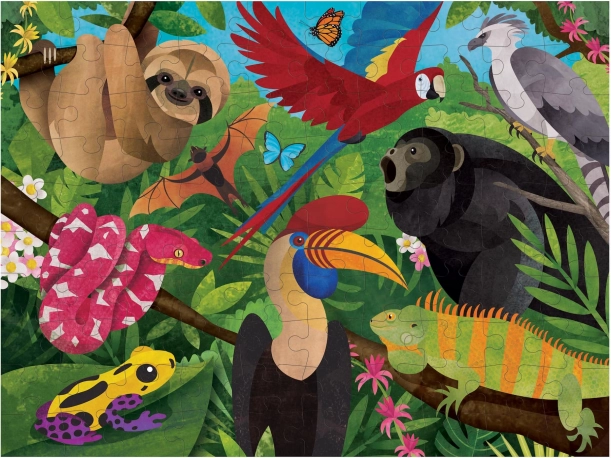 Puzzle-ul oferă două scene diferite ale vieții din pădurea tropicală, aducând distracție și învățare dublă.
