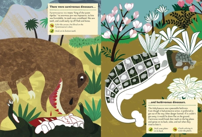 - 24 de activități pentru învățare creativă (de ex. lipirea dinților lui T. rex, colorarea plăcilor stegosaurului)