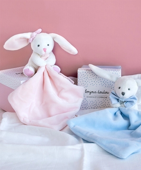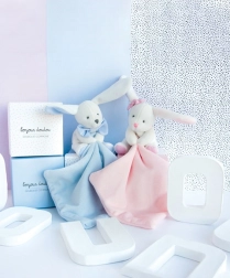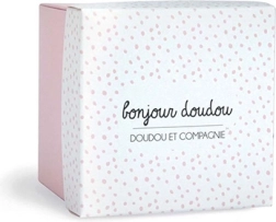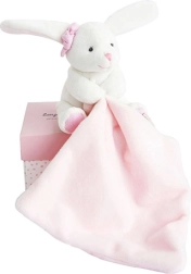 Acest iepuraș adorabil în cutie cadou elegantă este esențial pentru orice nou-născut. În alb cu o păturică roz, iepurașul este extrem de moale și devine rapid cel mai bun companion pentru copilul dvs.. O păturică mică în lăbuța sa servește ca o păturică ușor de prins.