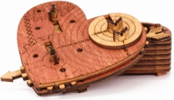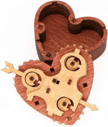 Această inimă stilată, cu rotițe dințate și gravură, ascunde un mecanism inteligent pe bază de cod. După setarea corectă a celor trei cuvinte, este suficient să tragi de săgeată și capacul se deschide. Poți folosi inima ca ambalaj sigur pentru o mică atenție, un mesaj personal sau ca puzzle decorativ de expus.