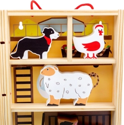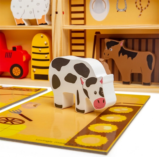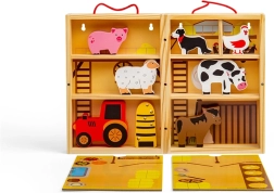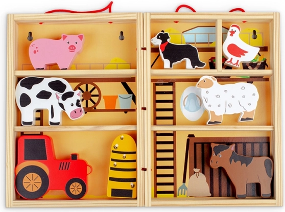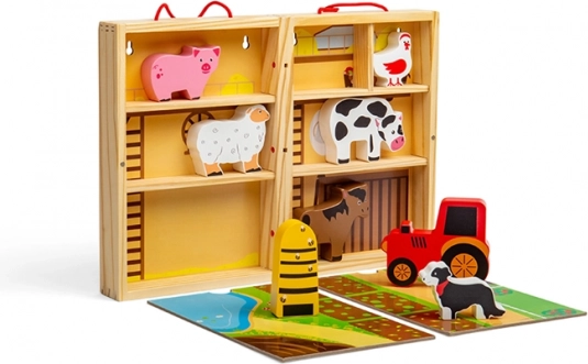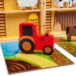 Include animăluțe (cal, vacă, câine, porc, oaie), un stup de albine și un tractor. Culori vii și execuție sigură din lemn masiv.