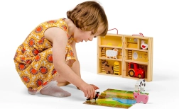 - Set complet: cutie – hambar, covoraș pliabil, cal, vacă, câine, porc, oaie, stup de albine și tractor.