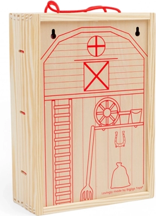 - cutie de joacă (hambar), covoraș de joacă pliabil, cal, vacă, câine, porc, oaie, stup de albine, tractor