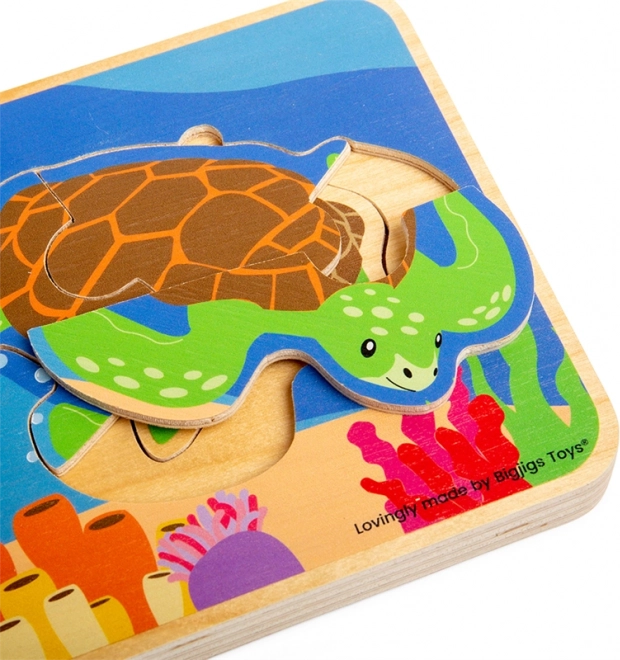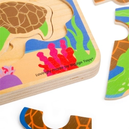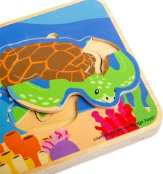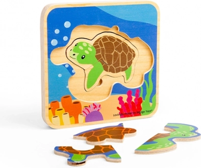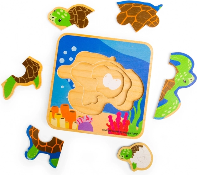 Acest puzzle din lemn, frumos ilustrat, le arată copiilor pe înțelesul lor cum crește țestoasa – de la ou, la pui și până la țestoasă adultă. Piesele se introduc în funcție de mărime, iar copiii descoperă pas cu pas fiecare etapă a dezvoltării.