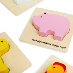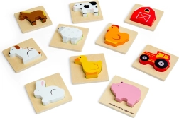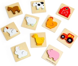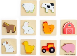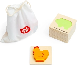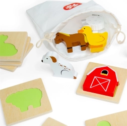Acest joc de călătorie cu tematica fermă aduce copiilor bucuria descoperirii. Ei introduc mâna în săculețul textil și caută prin pipăit piesa care se potrivește pe suportul din lemn corespunzător. O distracție care sprijină discret concentrarea, coordonarea mână–ochi și vocabularul, prin denumirea animalelor și obiectelor de la fermă.
