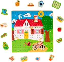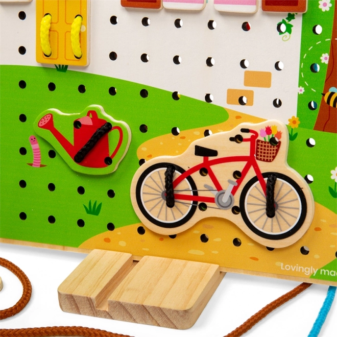 Descoperiți un joc creativ de înșiretare care dezvoltă imaginația și îndemânarea copiilor. Șnururile colorate și formele din lemn, precum ferestre, roată sau norișori, se introduc în placa perforată pentru a compune propriile imagini. Jucăria este din lemn și textile de calitate, are culori vii, susține motricitatea fină, abilitățile de coordonare și răbdarea și oferă ore întregi de distracție.