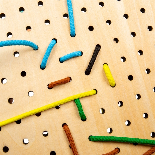 Înșiretarea șnururilor prin orificii și fixarea pieselor din lemn antrenează prinderea, precizia mișcărilor și concentrarea.