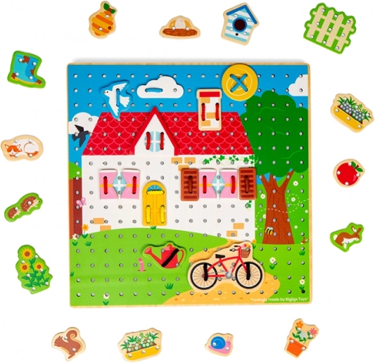 Placa de înșiretare căsuță BIGJIGS TOYS este o jucărie activă ideală pentru copiii de la 3 ani. Datorită plăcii din lemn perforate și șnururilor colorate, copiii pot crea din piesele individuale scene mereu noi – de la ferestruici și flori până la o roată sau nori. Astfel își antrenează în mod natural motricitatea fină, coordonarea mână–ochi și concentrarea.